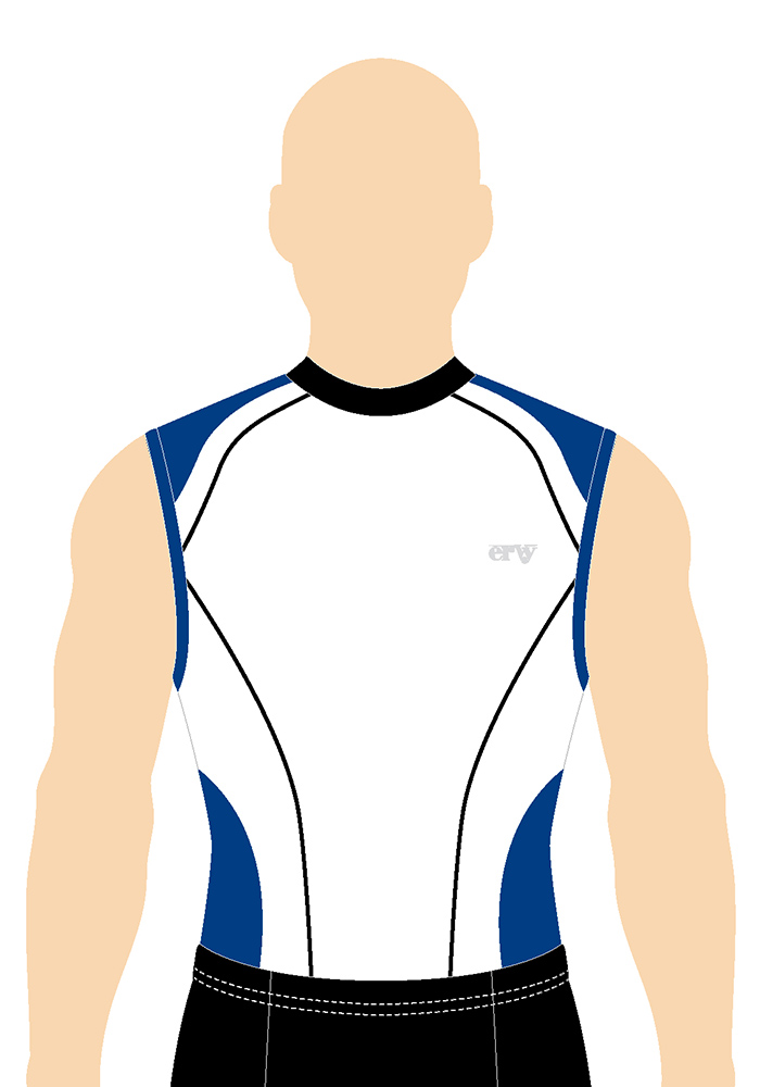 ERVY Akrobatiktrikot 3farbig ohne Arm dafür mit überschnittener Schulter. Er ist hochgeschlossen mit einem Stehbund und einem Rückenreißverschluss. Auf der Vorder- und Rückseite befinden sich Einsätze und Paspeln.