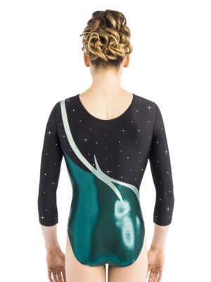 • ERVY Grün-schwarzer Turnanzug mit 3/4-Arm und dynamischem Design sowie Strass.ERVY glänzender Turnanzug in Grün und Schwarz mit dynamischem Design und Strass.